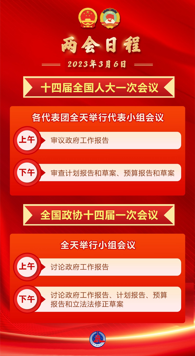 新華社北京3月5日電 十四屆全國人大一次會議各代表團6日全天舉行代表小組會議。上午審議政府工作報告,下午審查計劃報告和草案、預算報告和草案。