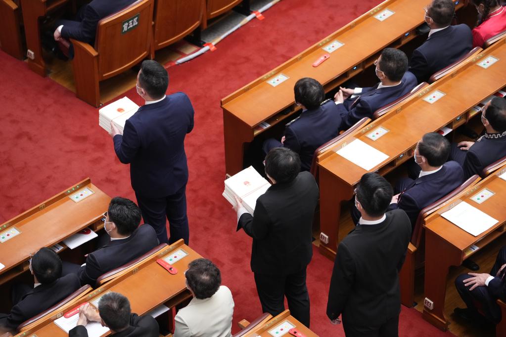 3月10日,十四屆全國人大一次會議在北京人民大會堂舉行第三次全體會議。這是工作人員準(zhǔn)備發(fā)放選票。