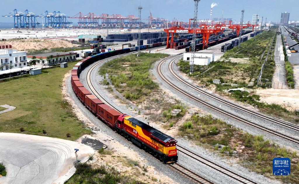 這是從廣西欽州港發出的首趟“北部灣—西藏”班列(2022年9月17日攝,無人機照片)。新華社記者 張愛林 攝