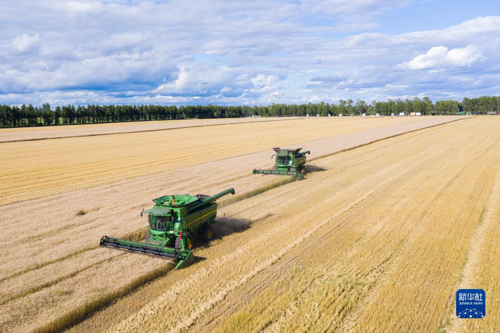 聯合收割機在黑龍江北大荒集團紅星農場有限公司田間收獲小麥(2022年8月10日攝,無人機照片)。新華社記者 謝劍飛 攝