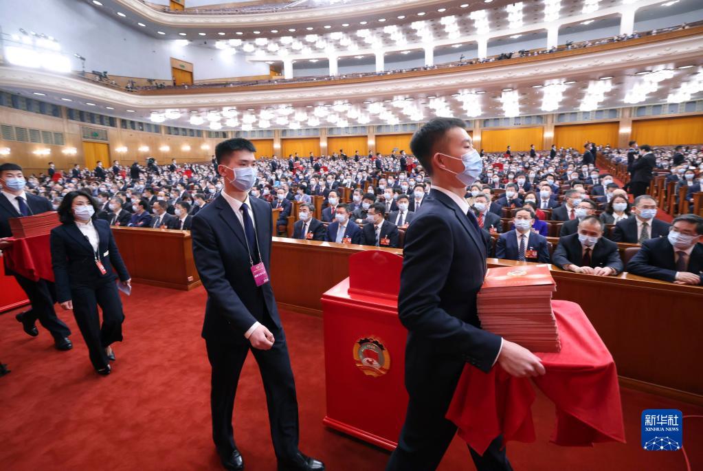 3月10日,全國政協十四屆一次會議在北京人民大會堂舉行第三次全體會議。這是工作人員準備發放選票。