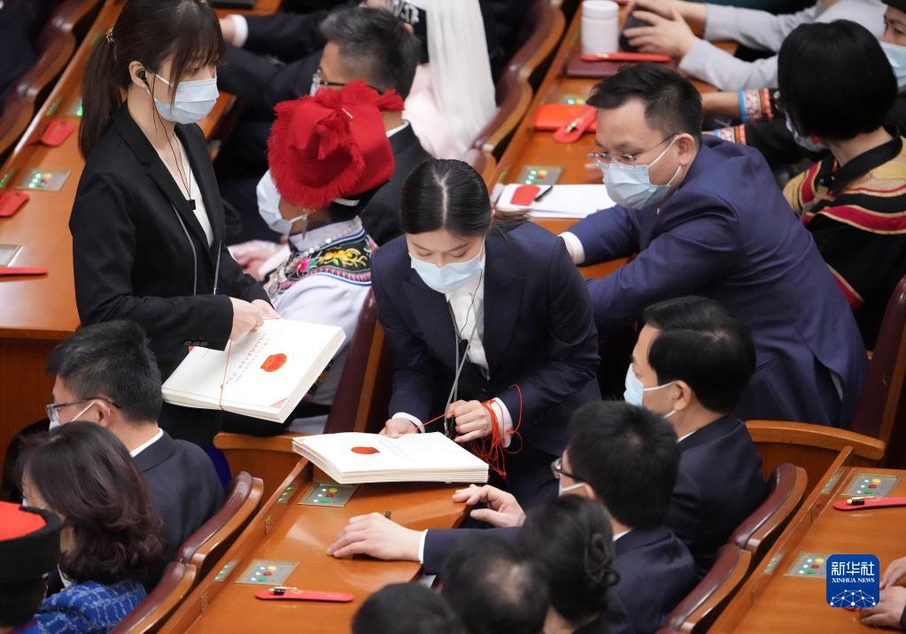 3月11日,十四屆全國人大一次會議在北京人民大會堂舉行第四次全體會議。這是工作人員發放選票。