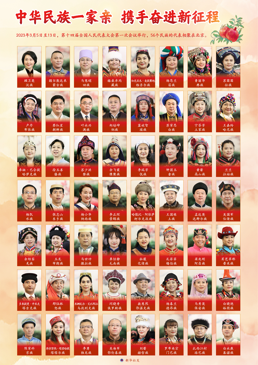2023年3月5日至13日,第十四屆全國人民代表大會第一次會議舉行,56個民族的代表相聚在北京。