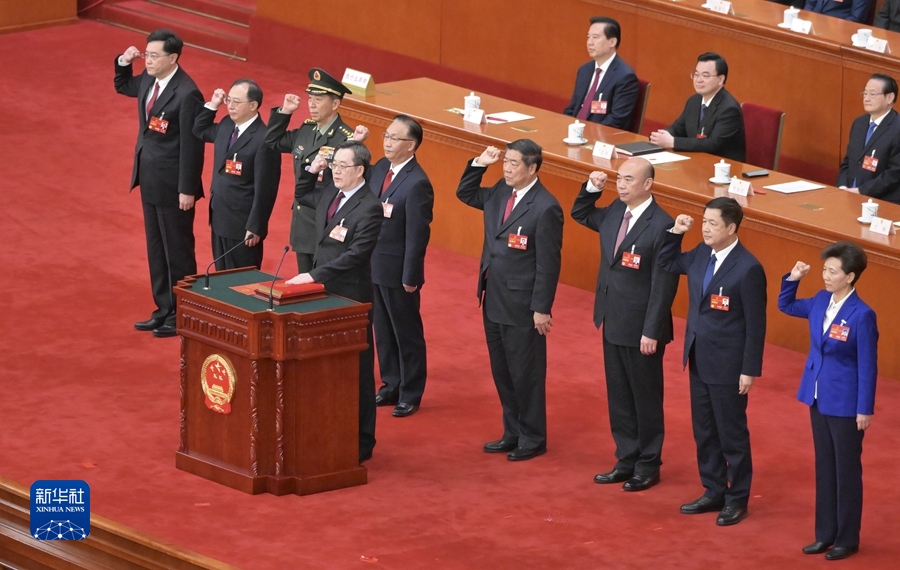3月12日,十四屆全國人大一次會議在北京人民大會堂舉行第五次全體會議。根據國務院總理李強的提名,經投票表決,決定丁薛祥、何立峰、張國清、劉國中為國務院副總理,李尚福、王小洪、吳政隆、諶貽琴、秦剛為國務委員,吳政隆為國務院秘書長。這是國務院副總理、國務委員、秘書長進行憲法宣誓。