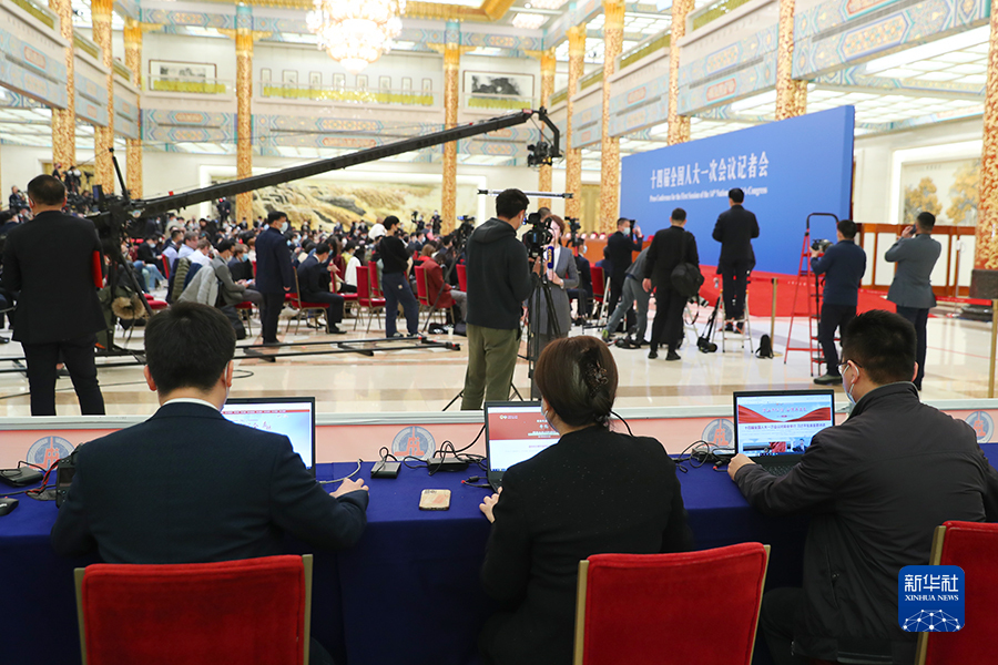 3月13日上午十四屆全國人大一次會議閉幕后,國務院總理李強在人民大會堂三樓金色大廳出席記者會并回答中外記者提問。圖為新華網直播團隊正在記者會現場工作。新華網記者 焦鵬 攝