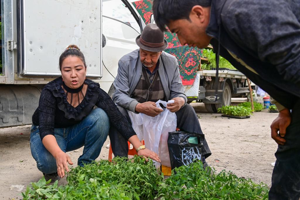 在新疆阿克苏地区温宿县克孜勒镇,种植户米哈热古丽·艾合麦提(左)在巴扎上介绍自己培育的菜苗(3月25日摄)。新华社记者 丁磊 摄