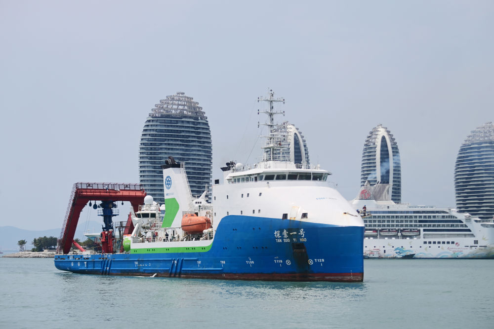 “探索一号”科考船搭载“奋斗者”号全海深载人潜水器返回海南三亚(2024年3月28日摄)。此次科考历时50天,顺利完成中国-印度尼西亚爪哇海沟联合深潜任务。新华社发(沙晓峰 摄)