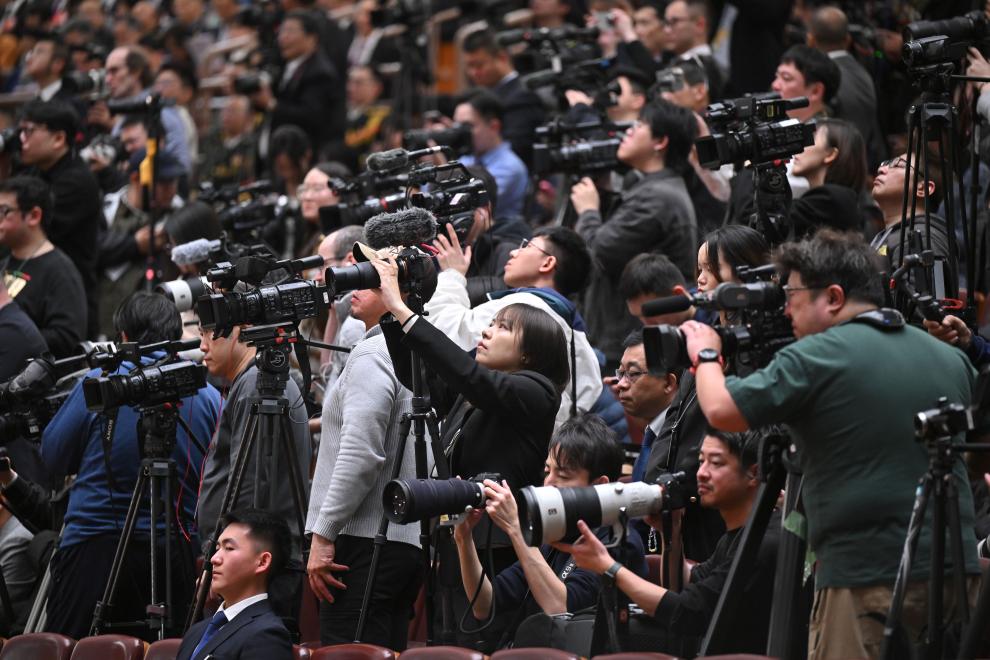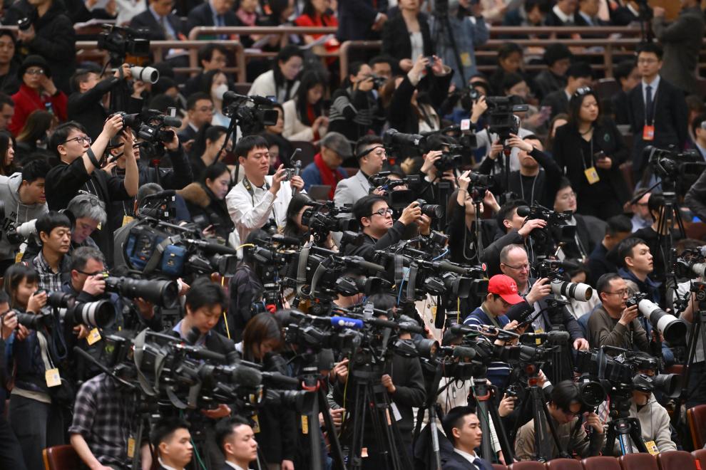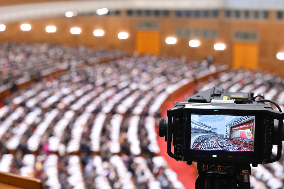 3月5日,十四届全国人大三次会议开幕会在北京人民大会堂举行。这是记者在会场采访。