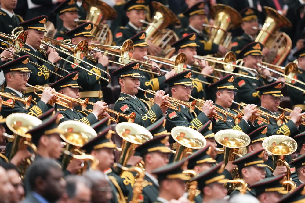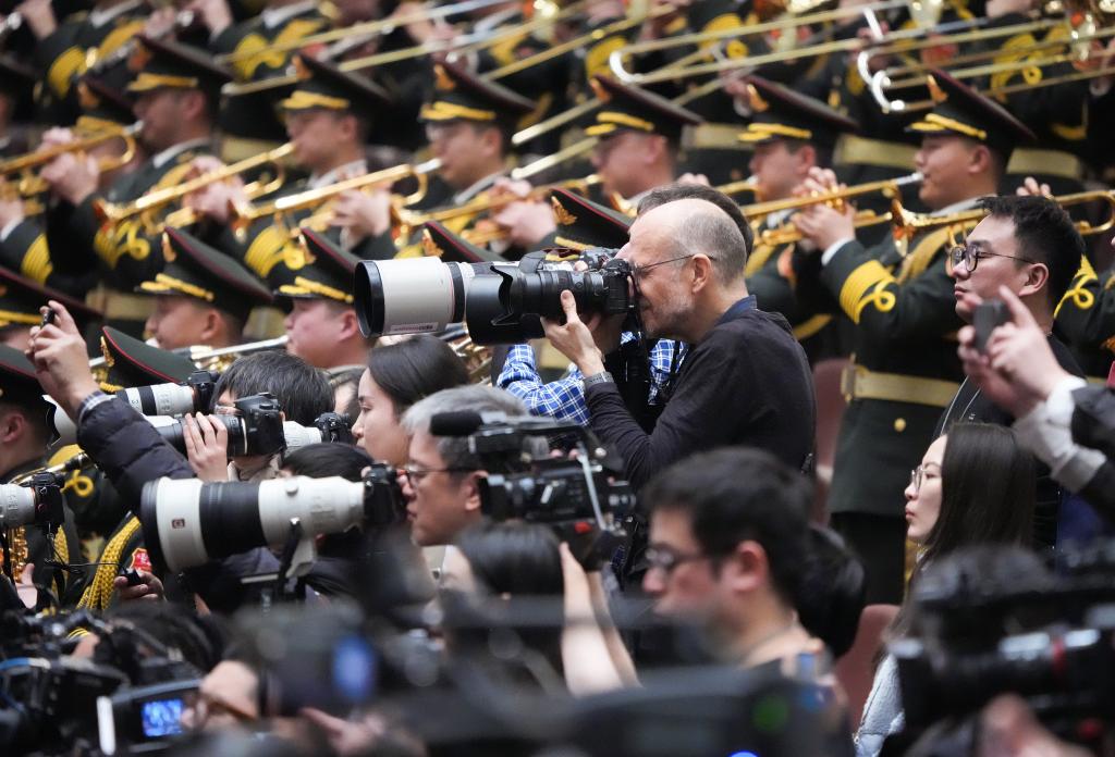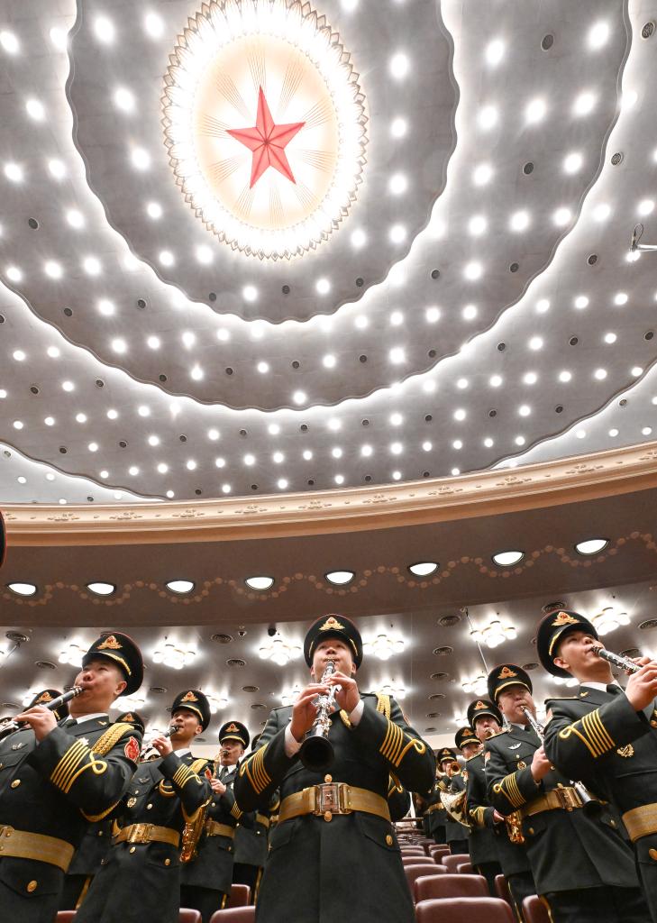 3月5日,十四届全国人大三次会议开幕会在北京人民大会堂举行。这是军乐团在演奏。