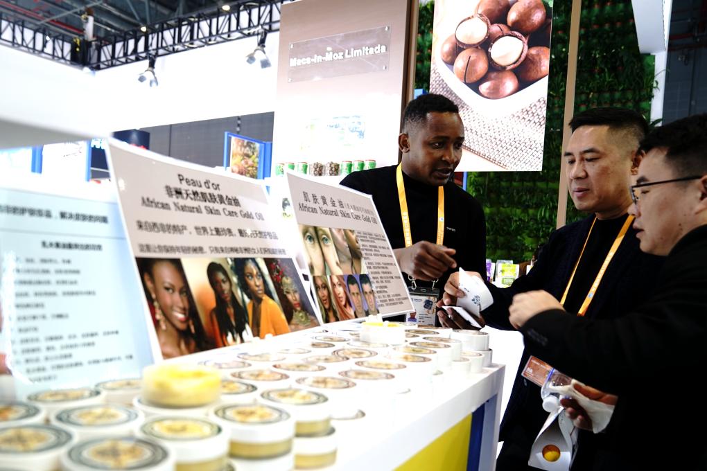 2024年11月7日,参展商在第七届进博会食品及农产品展区的非洲产品专区介绍产品。新华社记者 张建松 摄