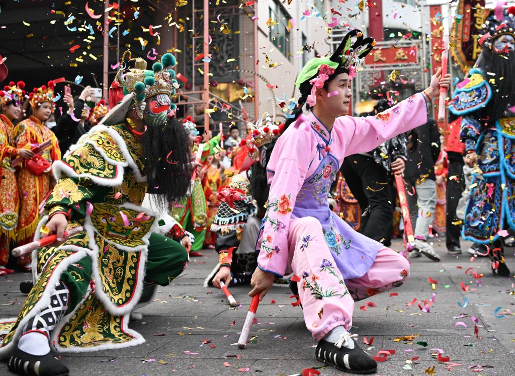 在广东汕头市潮阳区,塔馆英歌队队员在街头表演(2025年1月23日摄)。新华社记者 邓华 摄以“悟空”“哪吒”为代表的
