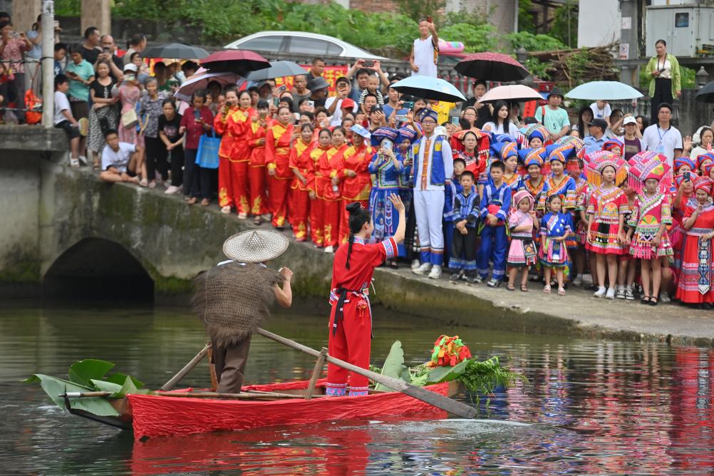 在广西柳州市融水苗族自治县汪洞乡,村民们在改造后的河道上进行“刘三姐河上实景演出”(2024年8月18日摄)。新华社记者 黄孝邦 摄