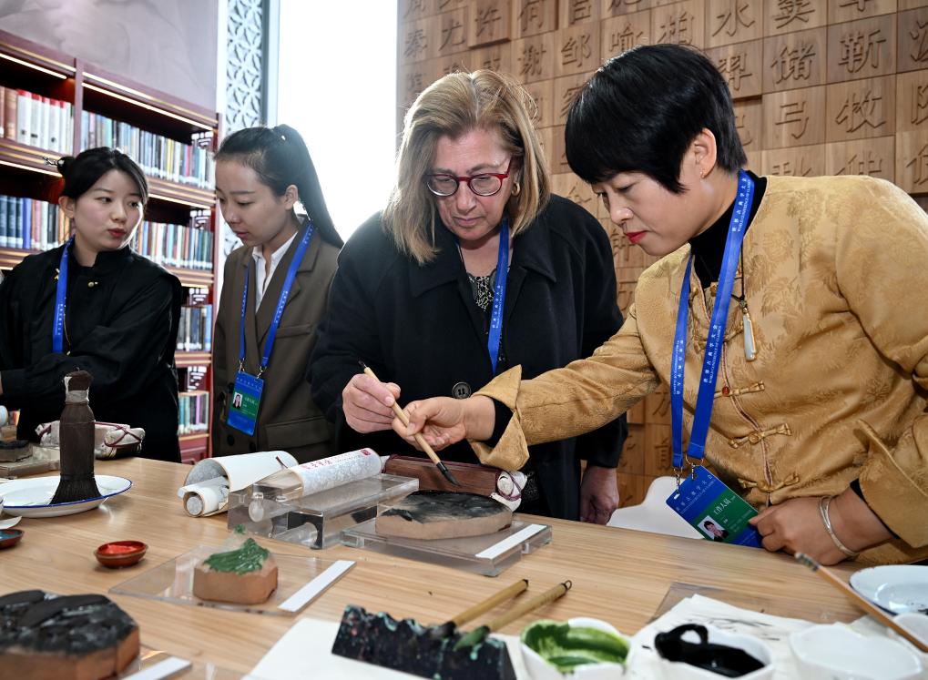 一名外国观众(右二)在北京体验“荣宝斋木版水印技艺”非遗项目(2024年11月7日摄)。新华社记者 李贺 摄