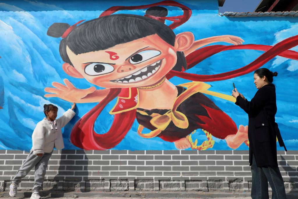 游人在山东省滨州市博兴县乔庄镇东冯村的哪吒主题墙绘前拍照(2025年3月1日摄)。新华社发(陈彬摄)