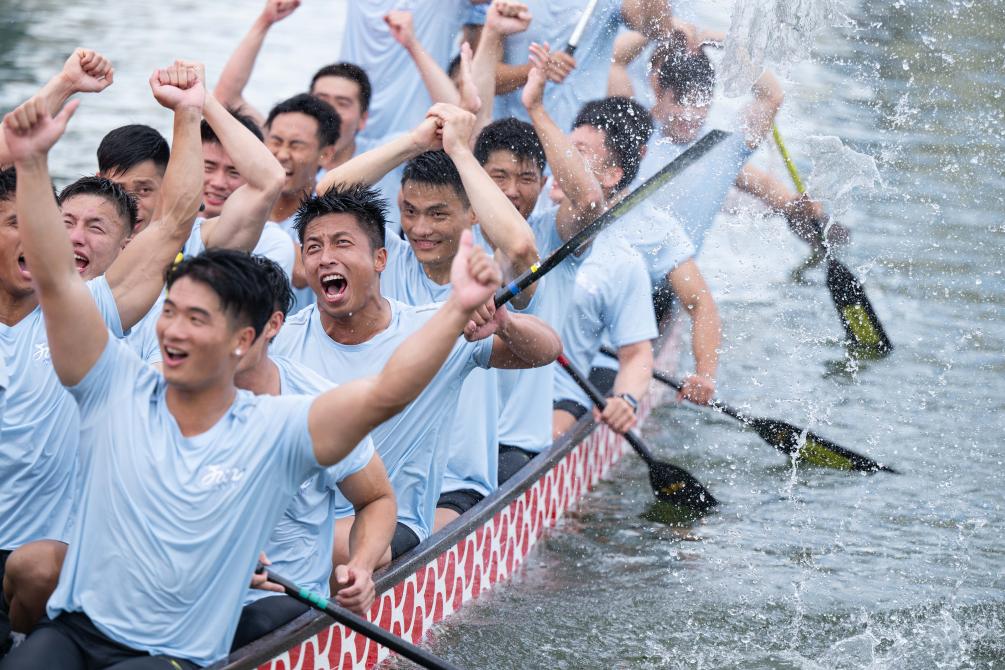 参赛者在2024澳门国际龙舟赛中庆祝(2024年6月10日摄)。新华社发(张金加 摄)