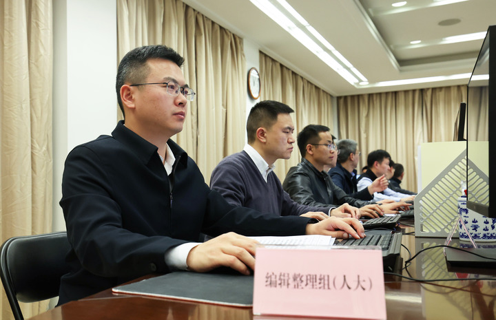 3月5日,国办工作人员对材料进行审核汇编。新华社记者 卢烨 摄