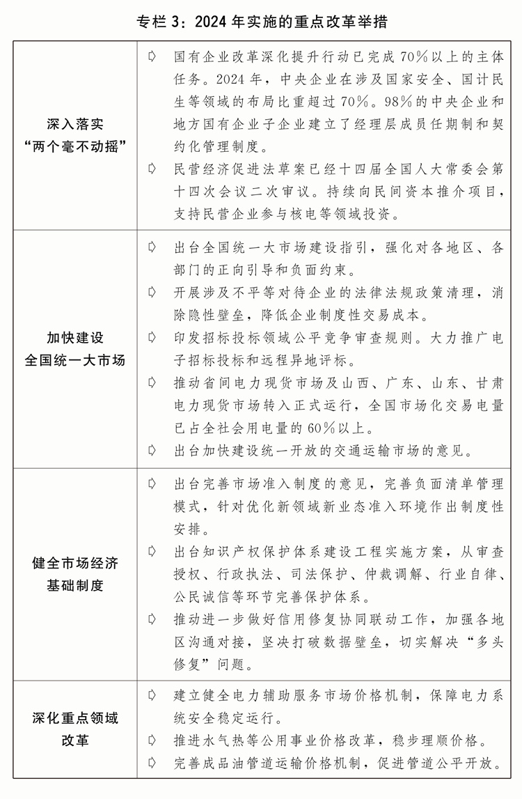 (二)进一步全面深化改革,发展动力活力不断增强。认真落实党的二十届三中全会部署的重要改革举措,深化经济体制改革,经济发展内生动力、创新活力持续激发。