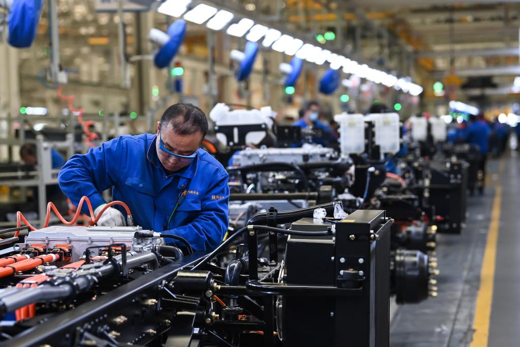 2025年2月27日,工作人员在位于宝鸡市岐山县的陕汽集团商用车有限公司总装车间生产线上作业。新华社记者 邹竞一 摄