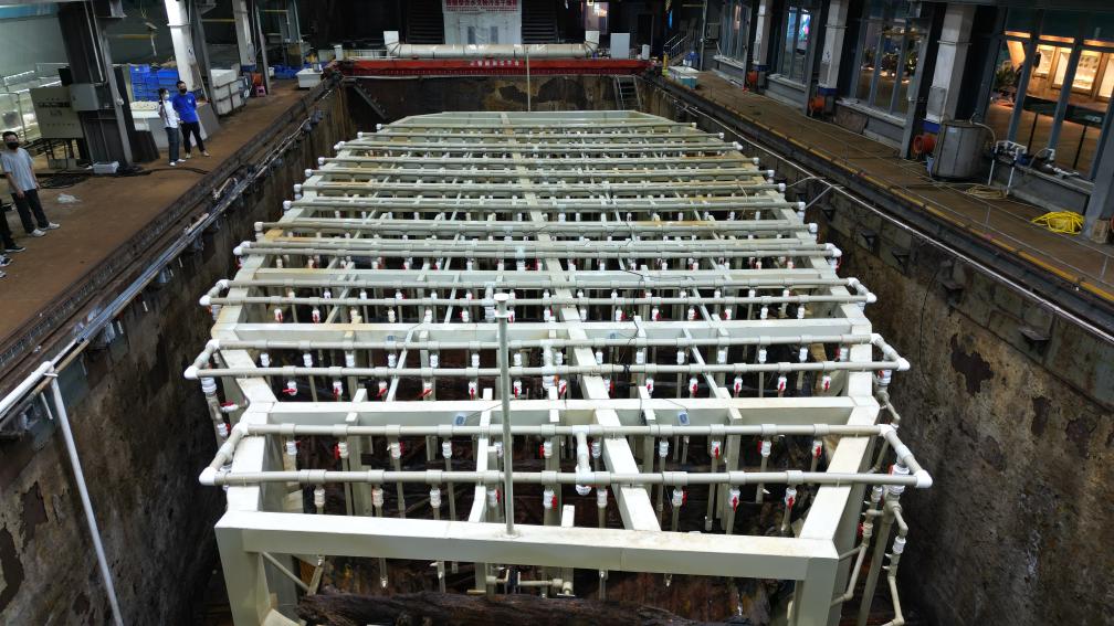 如今的“水晶宫”内,工作人员正在将陪伴了“南海Ⅰ号”十多年的沉箱逐步进行拆除。广东海丝馆馆长冯兆发介绍,目前已完成凝结物转运、南平台拆除,沉箱拆除进度约30%。