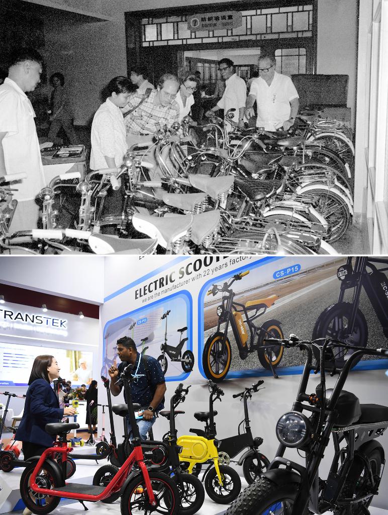 拼版照片,上图为:美国客商在1981年秋季中国出口商品交易会上选购自行车。(新华社记者黄鉴秋摄,1981年10月24日发);下图为2023年4月15日,采购商(右)和电动自行车参展商在第133届广交会上交流。(新华社记者邓华摄)