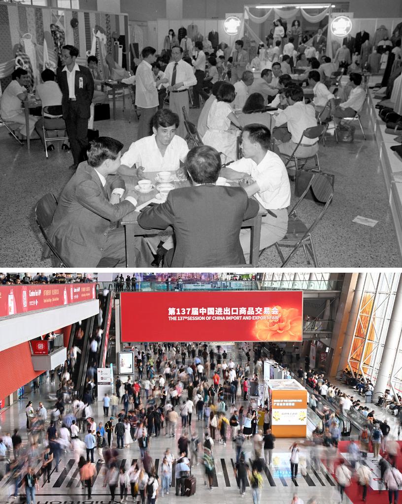 拼版照片,上图为:1984年秋季中国出口商品交易会1984年10月15日在广州开幕。来自世界各地的5900多位客商出席了开幕式。这是纺织品交易洽谈活动正热烈地进行(新华社记者黄鉴秋摄,1984年10月30日发);下图为:2025年4月23日拍摄的第137届广交会二期现场。到会境外采购商人数和现场意向出口成交等多项指标刷新历史纪录。截至5月4日,共有来自219个国家和地区的28.89万名境外采购商到会(新华社记者邓华摄)