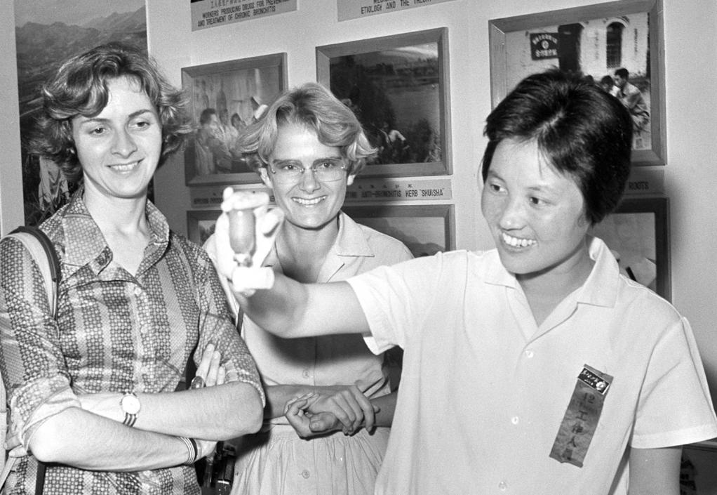 1977年秋季中国出口商品交易会上,交易会医疗卫生馆介绍的河南省防治慢性支气管炎的先进经验吸引了各国来宾。这是工作人员正在示范如何使用热参喷剂。