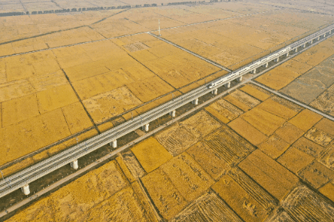10月14日,在吉林省公主岭市,一列高铁列车沿着田间的铁路线穿行(无人机照片)。2025年,吉林省深化农机研发、制造、推广、应用一体化试点示范,农作物耕种收综合机械化率达94.6%。新华社记者 张楠 摄