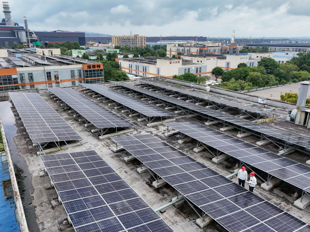 9月17日,在四川都江堰经济开发区,朱鹏宇(左)和同事检查工业用户新装屋顶光伏板情况(无人机照片)。新华社记者 王曦 摄