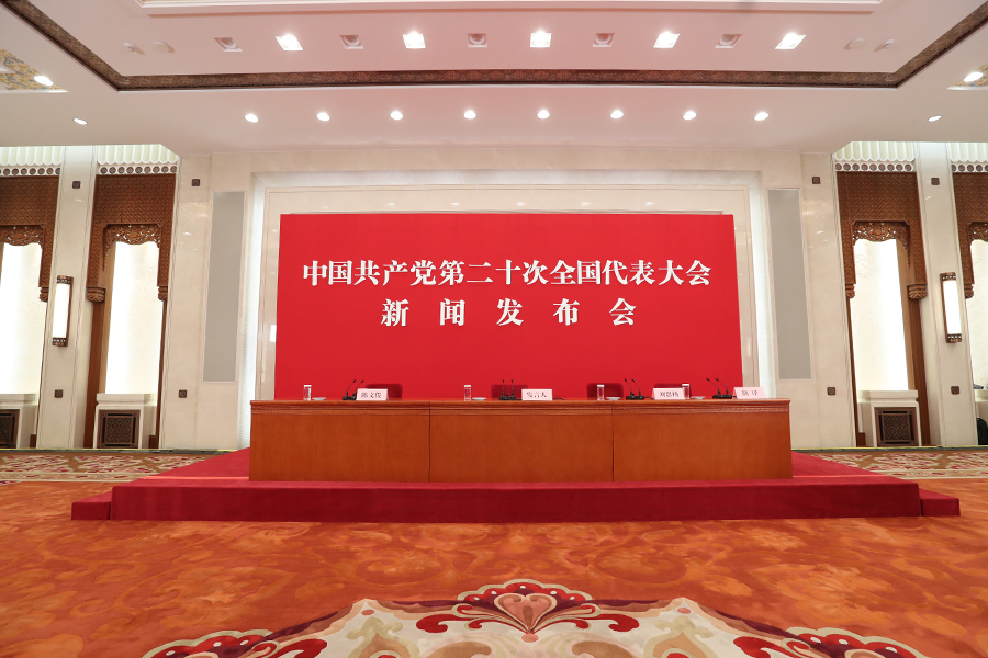 中國共產黨第二十次全國代表大會新聞發言人于2022年10月15日(星期六)16時30分在人民大會堂舉行新聞發布會。圖為發布會開始前。(新華網 王翰林 攝)