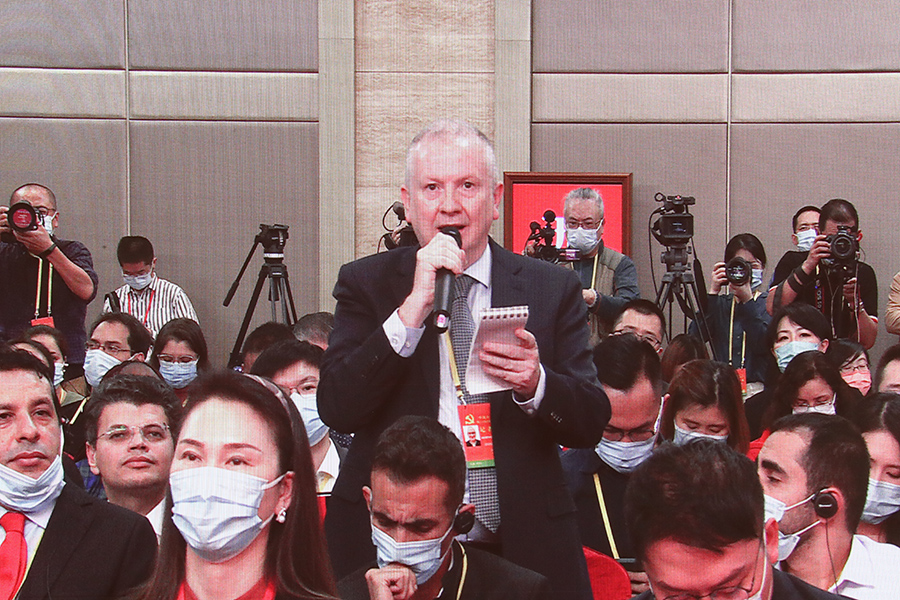中國共產(chǎn)黨第二十次全國代表大會(huì)新聞發(fā)言人2022年10月15日(星期六)16時(shí)30分在人民大會(huì)堂舉行新聞發(fā)布會(huì)。圖為彭博新聞社記者。(新華網(wǎng) 王翰林 攝)