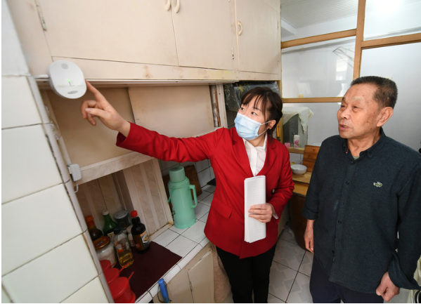 吉林省長春市長山花園社區黨委書記韓麗萍(左)到獨居老人家中檢查燃氣報警設備(資料照片)。新華社發