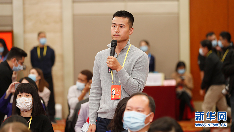 10月17日(星期一)10:00,二十大新聞中心在梅地亞新聞中心二層新聞發布廳舉辦第一場記者招待會。這是記者在分會場提問。(新華網 陳杰 攝)