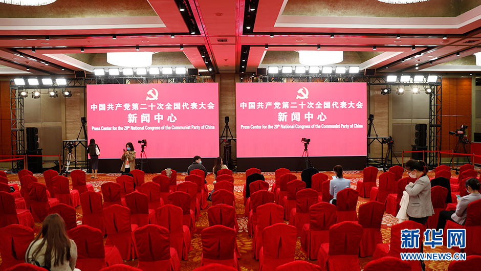 10月17日(星期一)15:00,二十大新聞中心將在梅地亞新聞中心二層新聞發布廳舉辦第二場記者招待會。圖為記者招待會前新世紀日航飯店三層世紀廳分會場。(新華網 陳杰 攝)