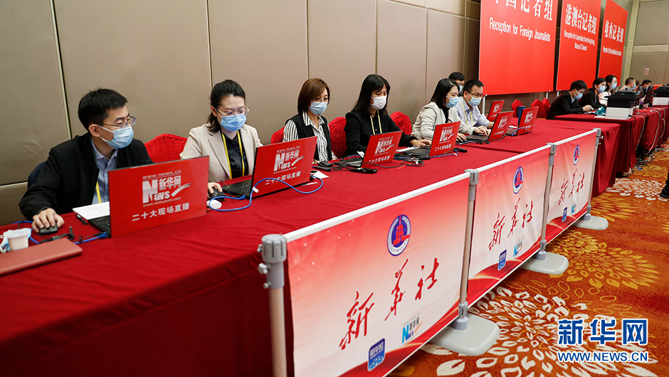 10月17日(星期一)15:00,二十大新聞中心在梅地亞新聞中心二層新聞發(fā)布廳舉辦第二場(chǎng)記者招待會(huì)。圖為記者在分會(huì)場(chǎng)工作。(新華網(wǎng) 陳杰 攝)