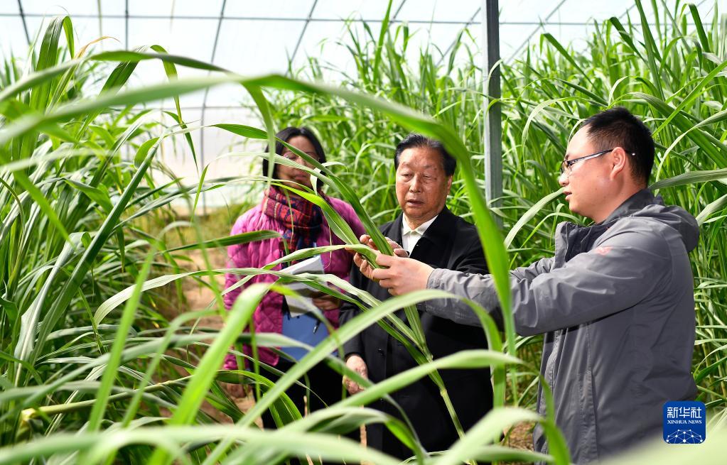 菌草專家林占熺(中)在寧夏銀川市永寧縣閩寧鎮農戶劉昌富的大棚里查看菌草生長情況(2021年3月29日攝)。新華社記者 王鵬 攝