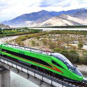 2021年6月25日,全長435公里、設計時速160公里的拉林鐵路建成通車,西藏首條電氣化鐵路建成,同時復興號實現對31個省區市全覆蓋。這是試運行的復興號列車行駛在西藏山南市境內(2021年6月16日攝)。新華社記者 覺果 攝