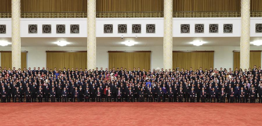 10月23日下午,中共中央總書記、國家主席、中央軍委主席習近平等領導同志在北京人民大會堂親切會見出席黨的二十大代表、特邀代表和列席人員,并同大家合影留念。新華社記者 鞠鵬 攝
