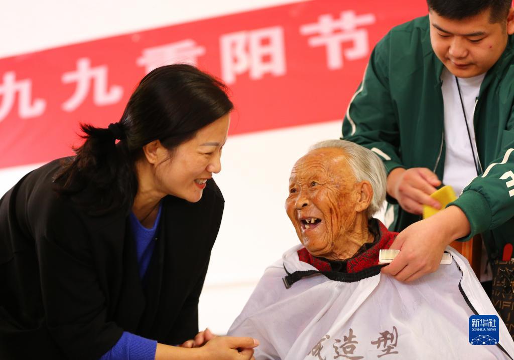 2022年10月4日,在山東省滕州市一家養老院,社會工作者為老人理發。新華社發(李志軍 攝)