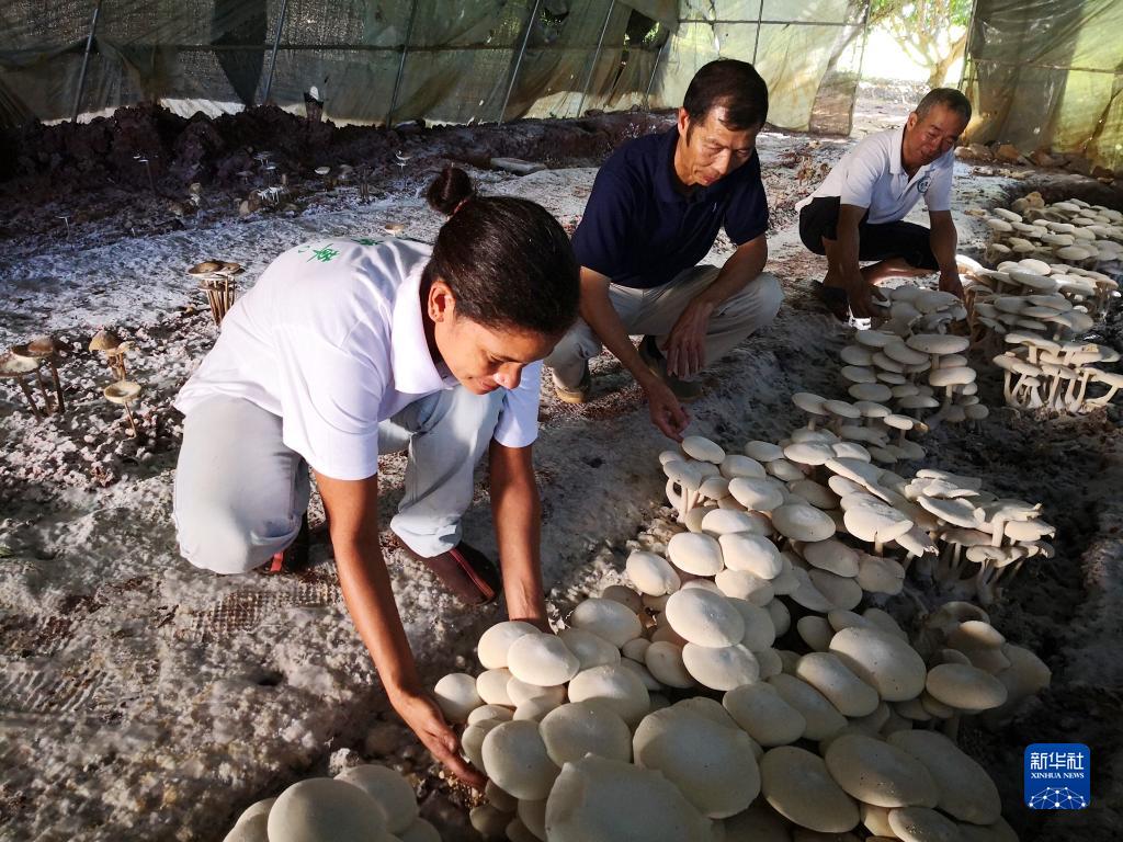 在斐濟楠迪,中國專家和當地雇員檢查菌菇生長情況(2018年6月12日攝)。新華社記者 張永興 攝