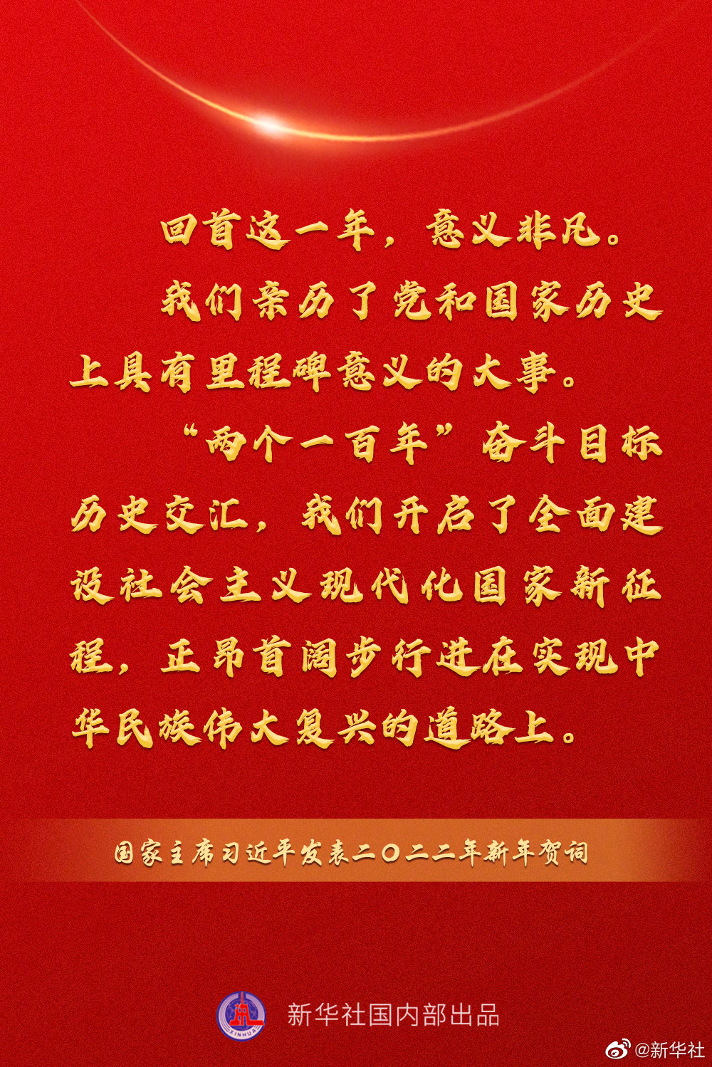 習近平:回首這一年,意義非凡。我們親歷了黨和國家歷史上具有里程碑意義的大事。“兩個一百年”奮斗目標歷史交匯,我們開啟了全面建設社會主義現代化國家新征程,正昂首闊步行進在實現中華民族偉大復興的道路上。