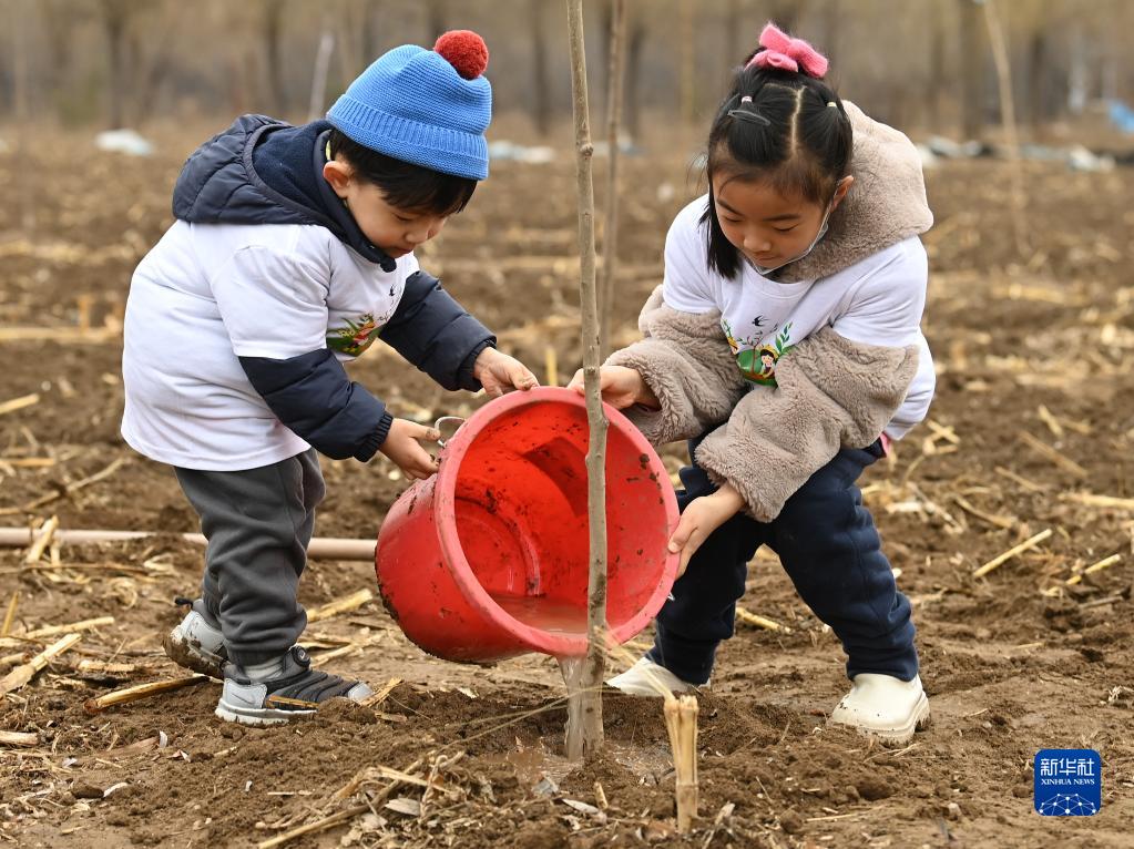 3月12日,在北京第五季龍水鳳港生態農場,小朋友在公益植樹活動上為樹苗澆水。新華社記者 李賀 攝