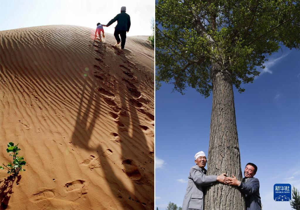這是一張拼版照片,左圖為:1998年8月,榆林市靖邊縣郭成旺老人帶著曾孫行進在沙漠中。老人希望子子孫孫植樹造林,直到沙漠都變成綠洲;右圖為:2020年5月22日,99歲的郭成旺老人(左)與孫兒郭建軍抱著當年栽下的第一棵楊樹,向參觀者介紹當年植樹的情景。1984年,郭成旺承包了離家10公里處的荒沙地,帶領全家常年吃住在沙地的簡易房里,為4.5萬畝沙漠披上了綠裝。新華社記者 陶明 攝