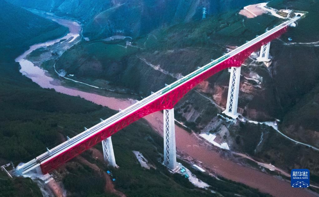 中老鐵路首發列車駛過中國云南省元江哈尼族彝族傣族自治縣境內的元江雙線特大橋(2021年12月3日攝,無人機照片)。新華社記者 王冠森 攝
