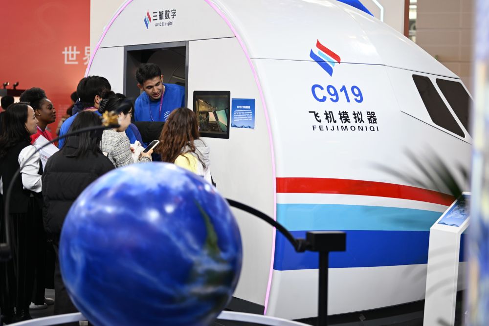 2024年11月21日,参会者在天津举行的世界职业技术教育发展大会专题展上参观C919飞机模拟器。展览设置了技能塑造人生、技艺传承文明、服务产业升级、国际交流合作、产教互融互通等7个板块,全方位展示职业教育改革发展成果。