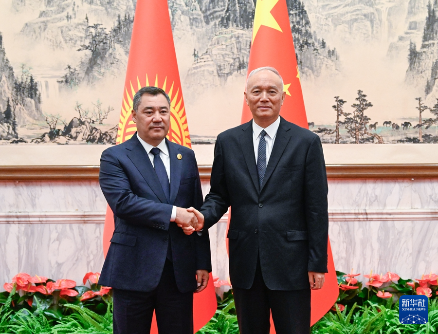 9月3日,中共中央政治局常委、中央书记处书记蔡奇在北京会见来华出席2025年上海合作组织峰会和纪念中国人民抗日战争暨世界反法西斯战争胜利80周年活动的吉尔吉斯斯坦总统扎帕罗夫。新华社记者 申宏 摄