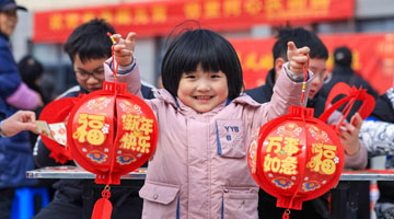 3月2日,游客带着小朋友在豫园商城选购手提花灯。