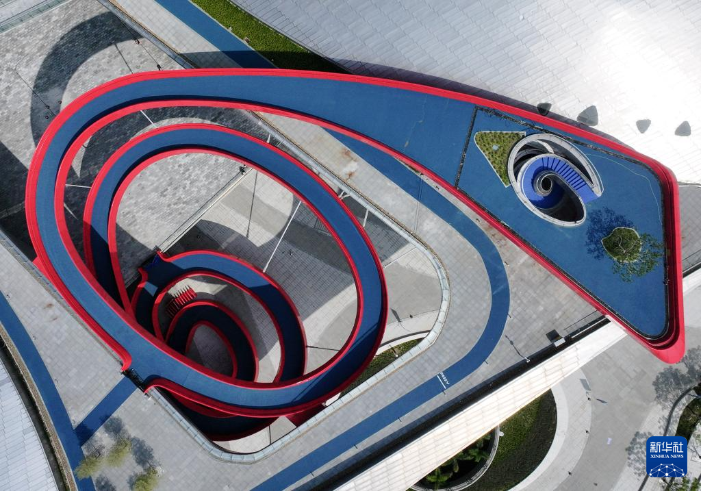 深圳湾体育中心(10月19日摄,无人机照片)。全运会篮球女子22岁以下组、马拉松比赛在这里举行。其中,全运会马拉松比赛从深圳湾体育中心周边道路起跑,以深圳湾大桥为纽带,横跨深圳、香港两地,最后回到深圳湾体育中心。