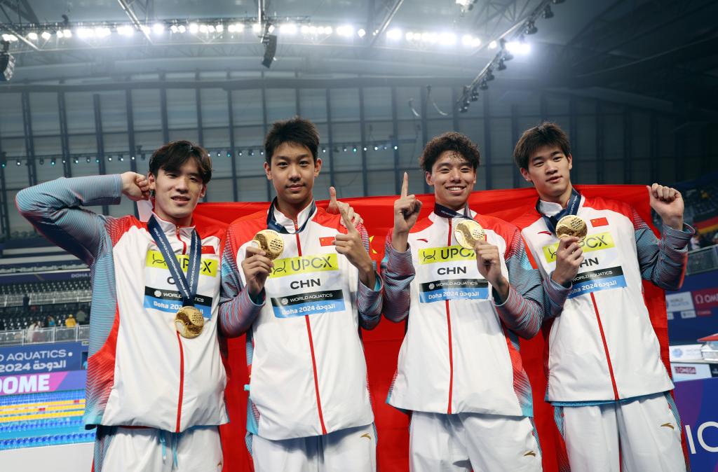 2024年2月11日,中国队选手王浩宇、张展硕、季新杰和潘展乐(从左到右)在颁奖仪式后合影庆祝。当日,在卡塔尔多哈进行的2024年世界游泳锦标赛游泳项目男子4X100米自由泳接力决赛中,中国队以3分11秒08的成绩夺冠。 新华社记者 雒圆 摄