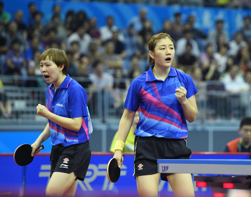 2017年9月5日,朱雨玲(左)/陈梦在第十三届全国运动会乒乓球女子双打半决赛中。她们4比2战胜山东/湖北组合选手刘高阳/冯亚兰,晋级决赛。新华社记者 牟宇 摄