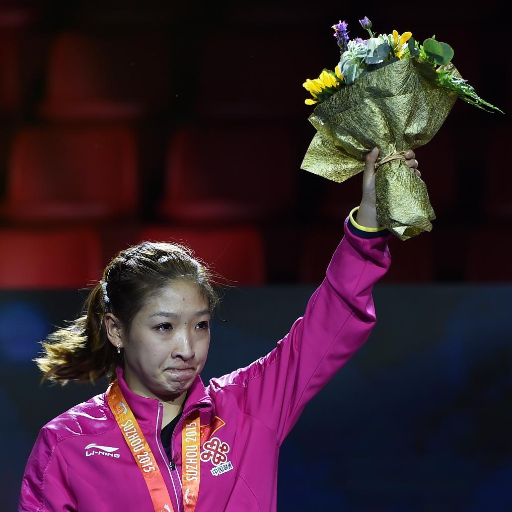 2015年5月2日,获得亚军的刘诗雯在第53届苏州世乒赛女单领奖台上。新华社记者 李响 摄